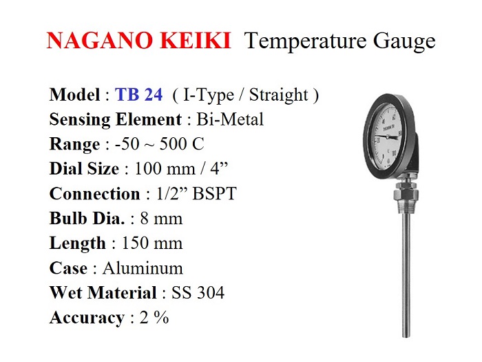 Jual Thermometer model Raket - Nagano Keiki TB 24 series / Bimetal, Dial size 100 mm. Temperatur -50 ~ 500 derajat C. Koneksi drat 1/2" BSPT. Dia. Probe 8 mm & Panjang 150 mm. Wet Material SS 304 & Aluminium Case.