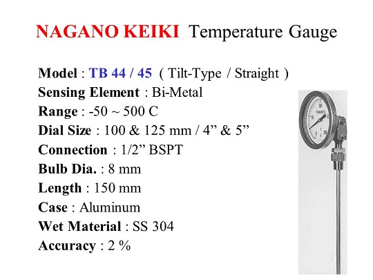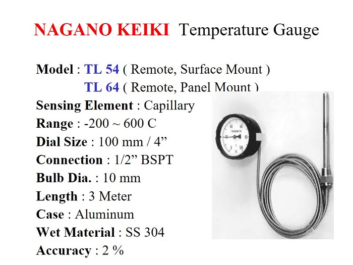 Jual Nagano Keiki Temperature Gauge TB 54 & 64 series / Capillary type, Dial size 100 mm ( 4" ), Temperature range -200 ~ 600 C. Koneksi drat 1/2" BSPT. Dia. Probe 10 mm & Panjang 3,000 mm. Wet Material SS 304 & Aluminium Case.