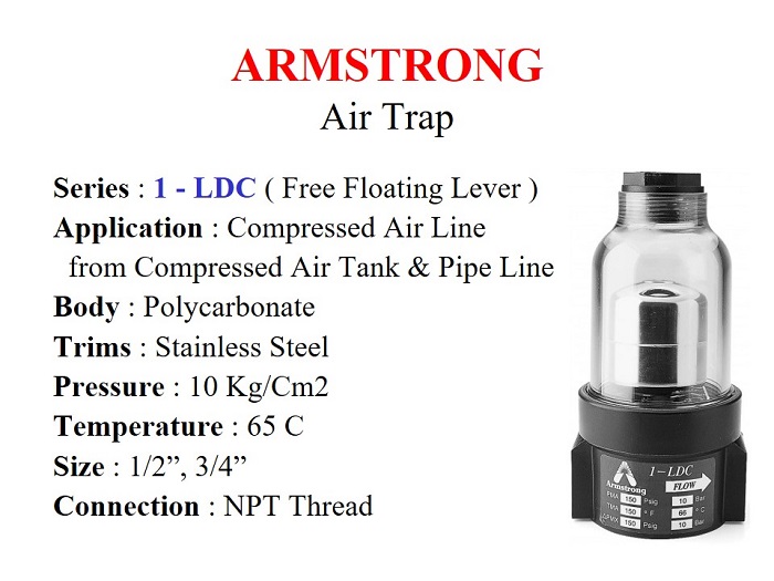 Air Trap is small device to eliminate Condensate from Pressure Tank or main Supply Line. Armstrong 1-LDC series is designed for low pressure Compressed Air supply. Trap operation can be easily seen via clear Polycarbonate Bowl. Note : Only used by Clean Air as Oily Condensate will plug Outlet Drain. Jual / Beli Ex-Stock. Quick Delivery dari Jakarta / Indonesia. Best Seller !