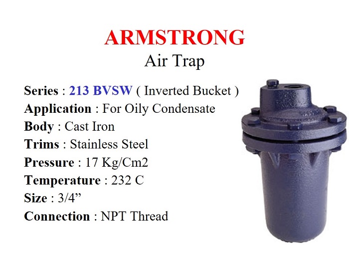 Armstrong Air Trap 213 BVSW series is Inverted Bucket design with enlarged vent and scrub wire to cater heavy oil and dirt in compressed air Receiver or Pipelines.