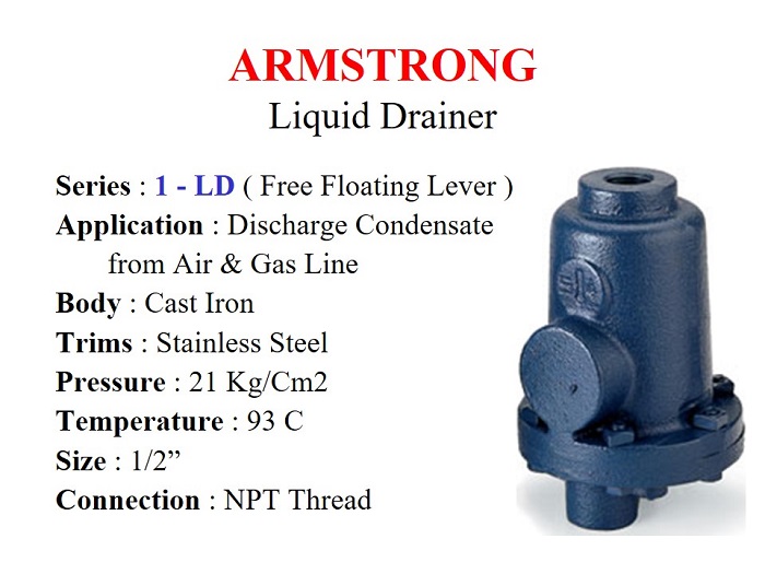 Liquid Drainer drains Condensate formed inside Compressed Air / Gas pipelines. Armstrong 1-LD series is low pressure Liquid Drainer with Cast Iron body.