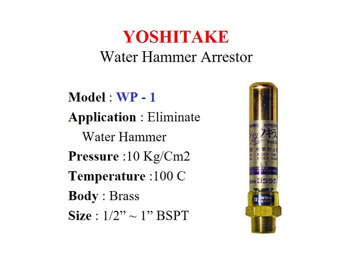 Yoshitake WP-1 Water Hammer Arrestor is meant to reduce the impact of Water Hammer when Valves are closed abruptly. The perfect installation is close to Point of Use / before Sink & Shower Valves. Water Hammer if not managed, will cause damage to Pipe Joint and leaks eventually. During hammering, causes large sound and vibration.