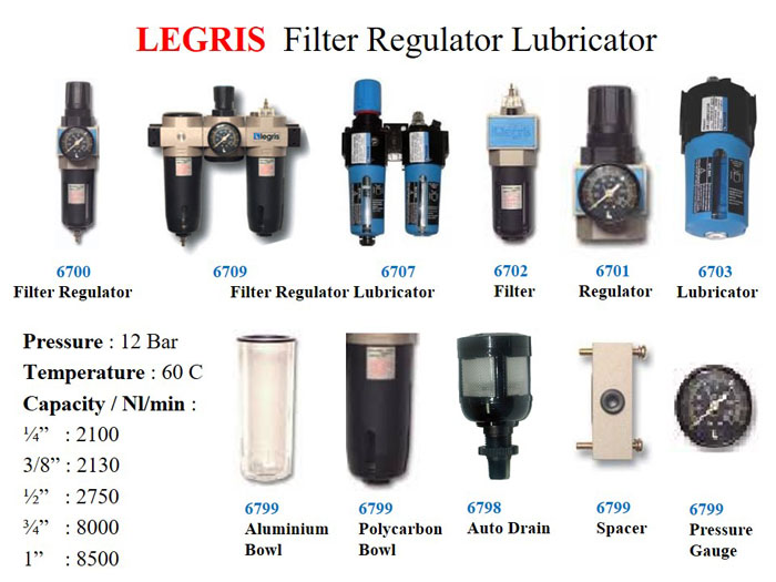 Legris manufactures full range of Air Treatment Units. Filter, Regulator, Lubricator / FRL.