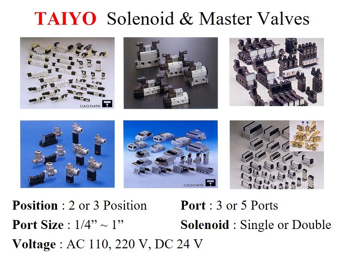 Jual Pneumatic Solenoid Valve, Master, Foot & Hand Valves merek Taiyo dengan ukuran 1/4" s/d 1". Tersedia 2 & 3 Posisi, 5 & 3 Lobang dengan 1 atau 2 Coils AC 220, DC 24 V. Tersedia Ex-stock.