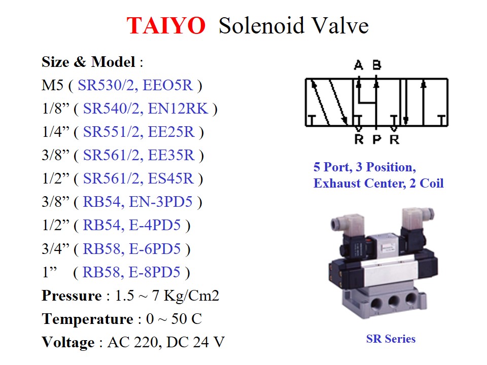 Taiyo SR-EE & RB-EE series are 5 port, 3 position ( Exhaust Center ), Double coil Pnematic Solenoid Valve.