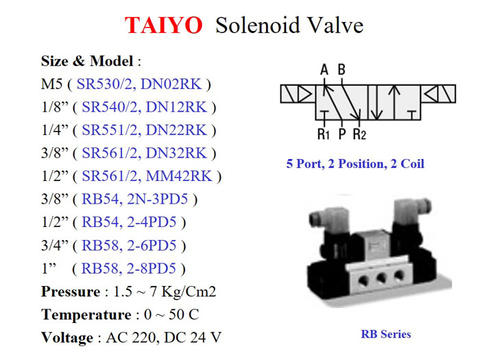 Taiyo SR-SN & RB-SN series are 5 ports, 2 position single coil Pneumatic Solenoid Valve for general purpose use.