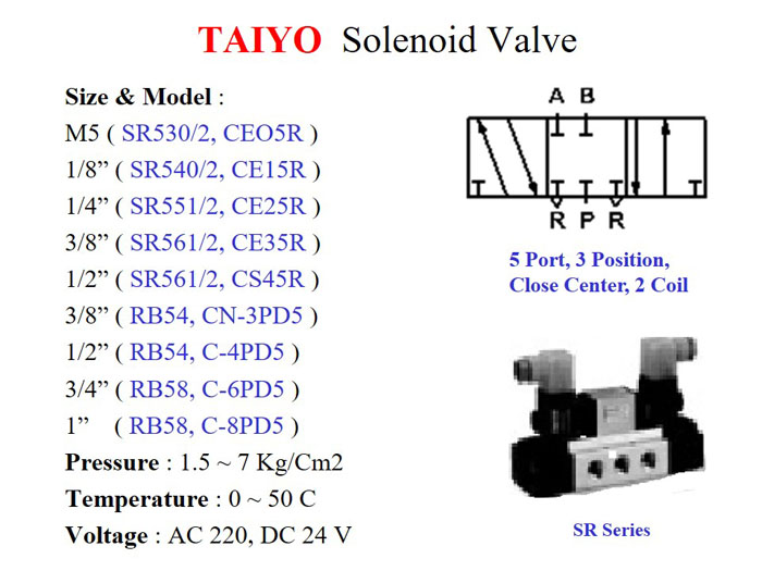 Taiyo SR-CE & RB-CE series are 5 port, 3 position ( Close Center ), double coils Pneumatic Solenoid Valves.