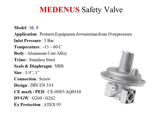 Medenus SL-5 series Safety Valve is used to protect downstream capital equipment in case of over pressure.