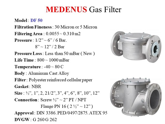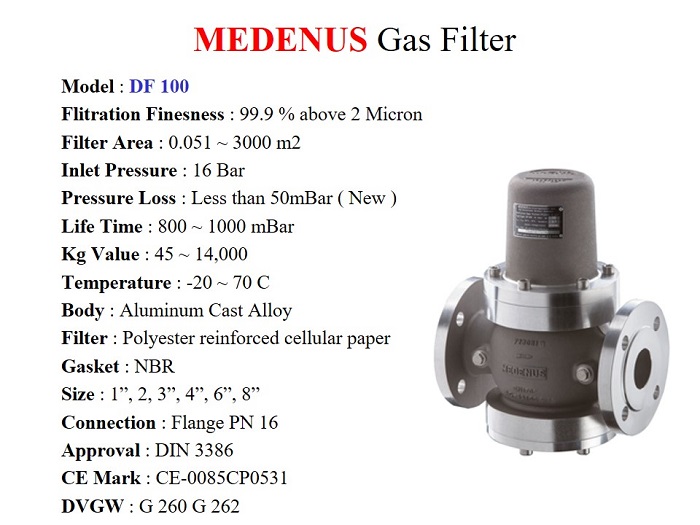 Medenus DF-100 series Gas Filter is good for pressure up to 16 Bar.