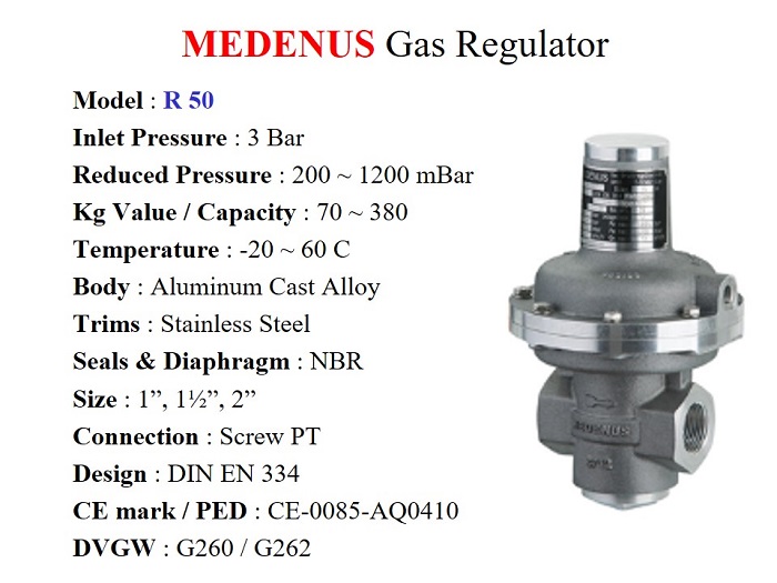 Medenus R 50 series Gas Pressure Regulator is basic Pressure Reducing Valve with 3 Bar inlet pressure.