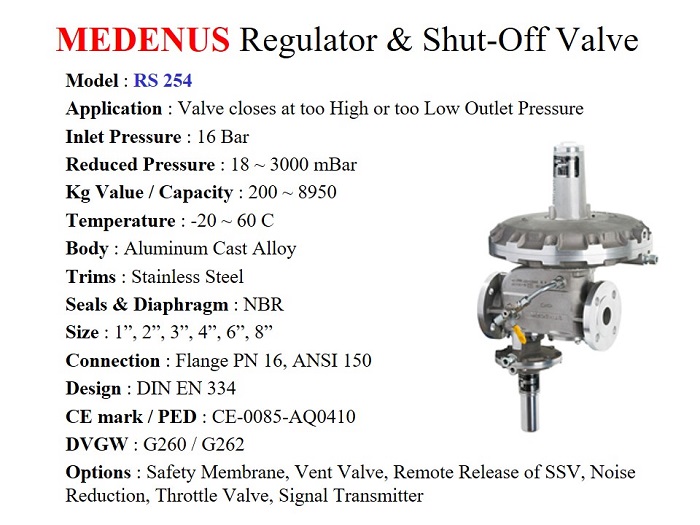 Medenus RS 254 series Gas Pressure Regulator with Safety Shut-Off is a combination of Pressure Reducing Valve with 16 Bar inlet pressure and Safety Shut-Off Valve to close upon too low or high inlet pressure.