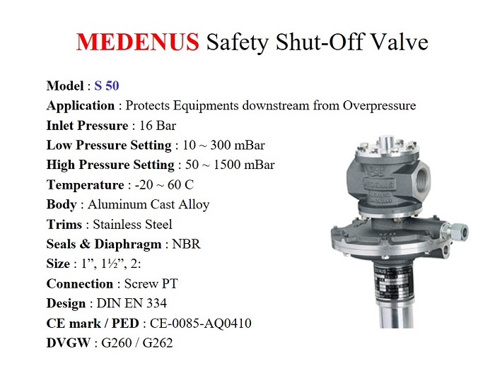 Medenus S 50 series Gas Safety Shu-Off Valve is to protect overpressure in the system.