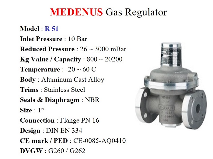 Medenus R 51 series Gas Pressure Regulator is basic Pressure Reducing Valve with 10 Bar inlet pressure.