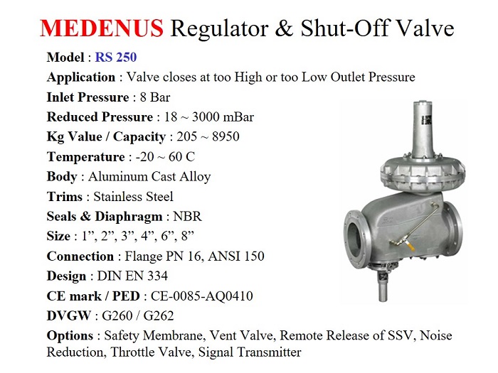 Medenus RS 250 series Gas Pressure Regulator with Built-In Shut-Off Valve is a combination of Pressure Reducing Valve with 8 Bar inlet pressure and Safety Valve to close upon too low or high inlet pressure.