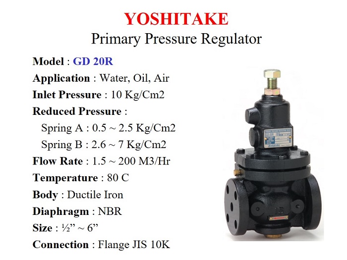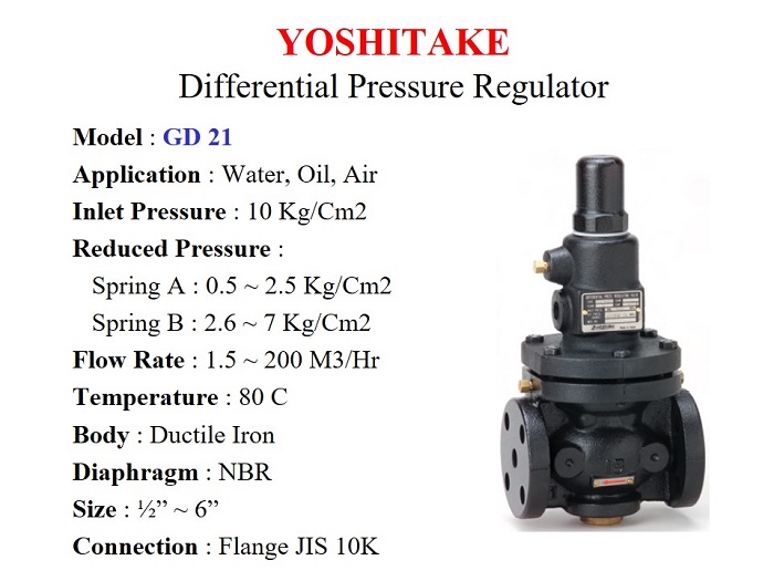 Yoshitake GD-24 is Water Regulating Valve. Used widely in High Rise Building to maintain even pressure to individual floor. Also in factory to meet the Process demand.