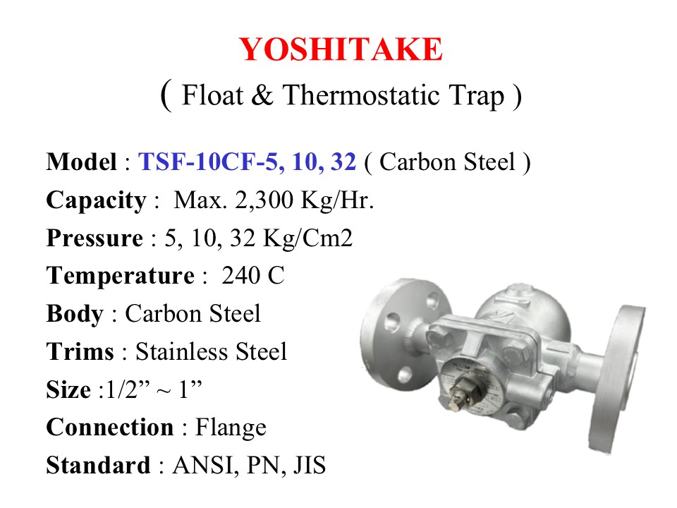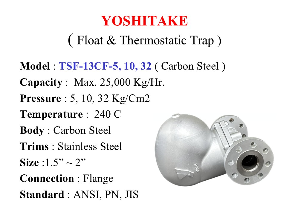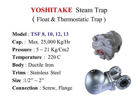 Yoshitake Float & Thermostatic Steam Trap - Series TSF-13CF is made from Carbon Steel and withstand pressure up to 32 Bar, Has high Capacity 25,000 Kg/Cm2 ideal for Process use.
