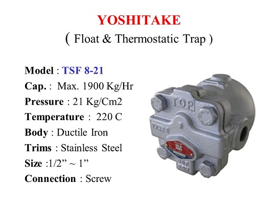 Jual Float & Thermostatic Steam Trap merek Yoshitake TSF-8-21 yang mampu untuk tekanan s/d 21 Bar dengan kapasitas 1900 Kg/Hr. Tersedia juga TSF-8-5 / 5 Bar dan TSF-8-10 / 10 Bar. Di-banding series TSF-10, TSF-8 memiliki Tekanan kerja dan kapasitas yang sama. Bedanya, TSF-10 memiliki fitur Selectable Flow Direction untuk pemasangan Vertikal atau Horisontal.