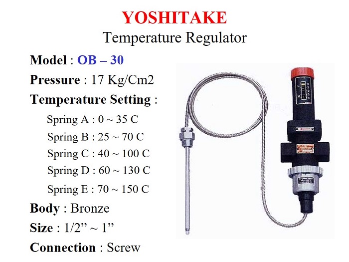 Yoshitake Temperature Regulator OB-30 is Self/Direct Acting Temperature Control Valve used to heat Calorifier Tank with Steam to produce Hot Water ranging 0 ~ 150 C.