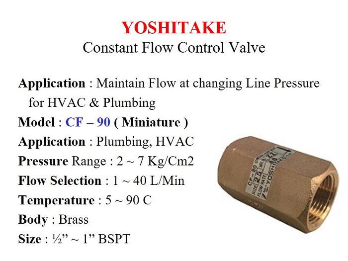 Yoshitake Constant Flow Valve CF-90 is Automatic Flow Control Valve that maintains constant Flow Rate despite changes in line pressure. Flow Option 1 ~ 40 L/Min at Pressure Range 2 ~ 7 Bar. Ideal for Low Capacity Plumbing & HVAC use.