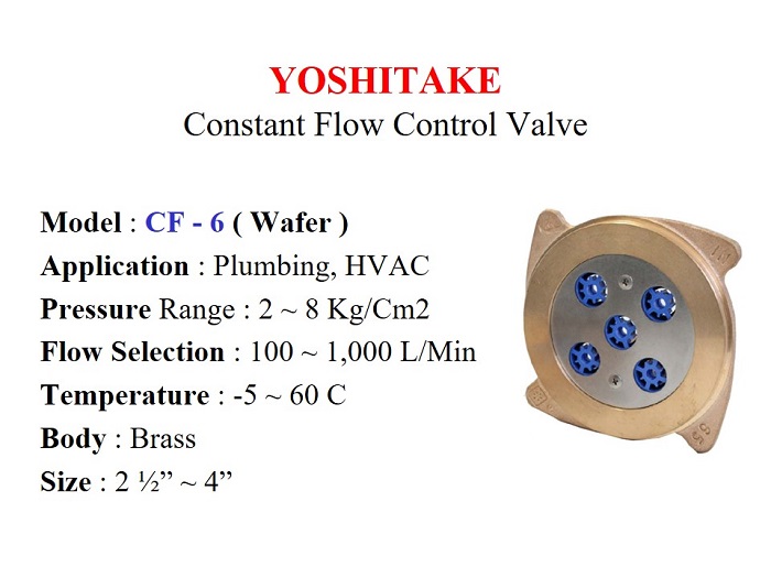 Yoshitake Constant Flow Valve CF-6 is Automatic Flow Control Valve that maintains constant Flow Rate despite changes in line pressure. Flow Option 100 ~ 1,000 L/Min at Pressure Range 2 ~ 8 Bar. Wafer body. Ideal for Plumbing & HVAC use at High Flow Capacity.