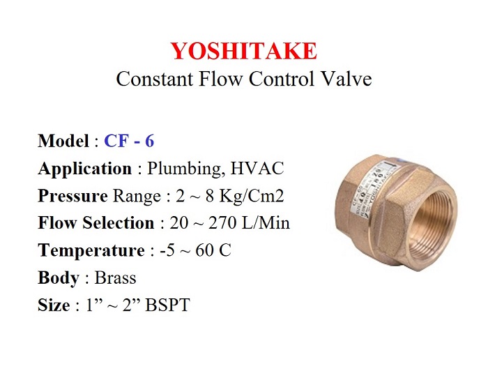 Yoshitake Constant Flow Valve CF-6 is Automatic Flow Control Valve that maintains constant Flow Rate despite changes in line pressure. Flow Option 20 ~ 270 L/Min at Pressure Range 2 ~ 8 Bar. Ideal for Plumbing & HVAC use.