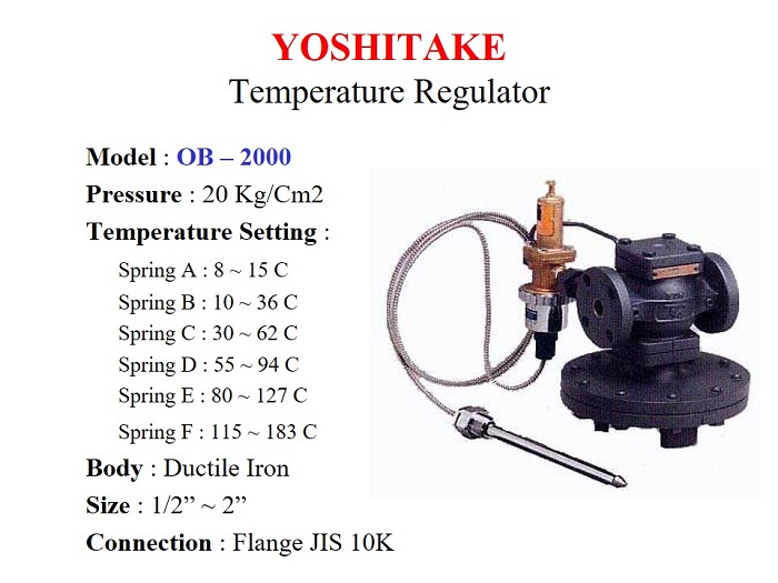 Yoshitake Temperature Regulator OB-2000 is Self/Direct Acting Temperature Control Valve used to heat Calorifier Tank with Steam to produce Hot Water ranging 8 ~ 183 C.
