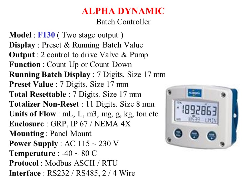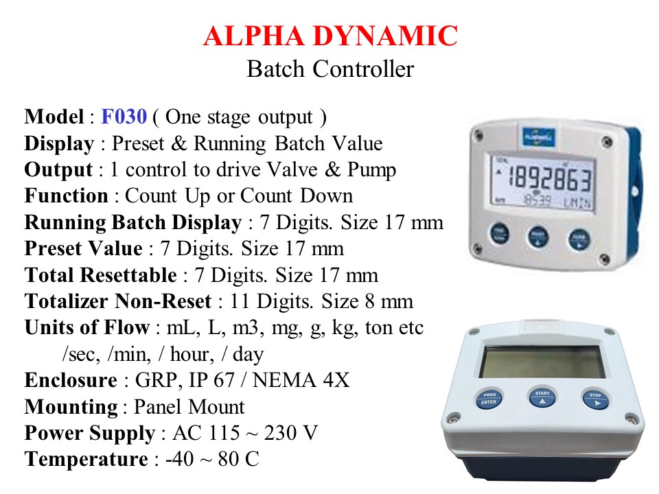 Series F030 Controller is meant for Batching to switch on or off either Pump, Valve, Light Indicator or Alarm.