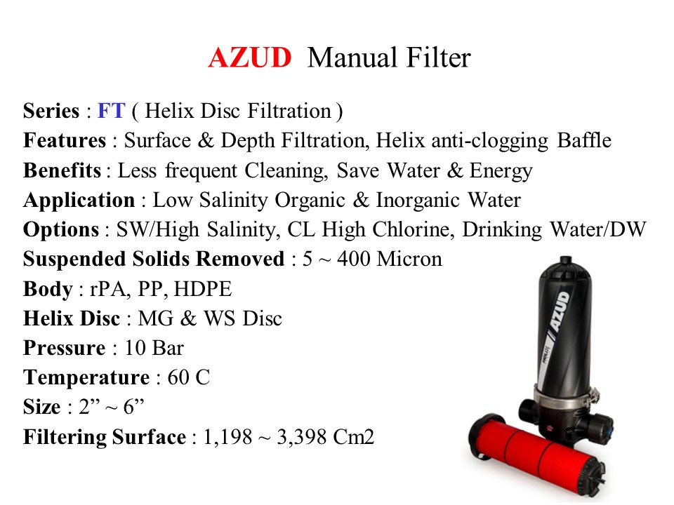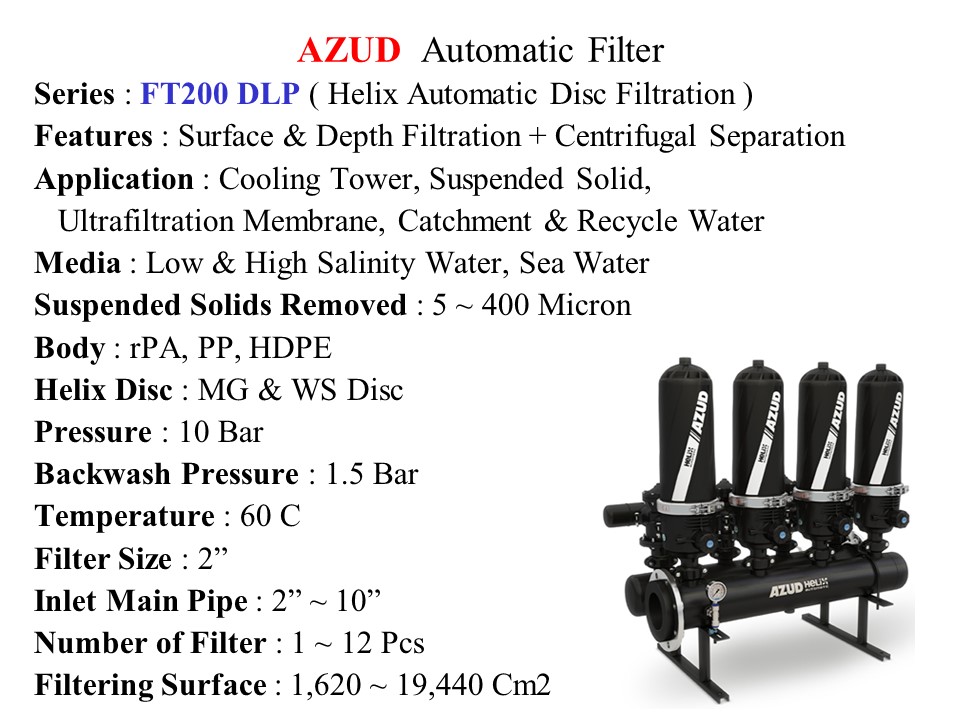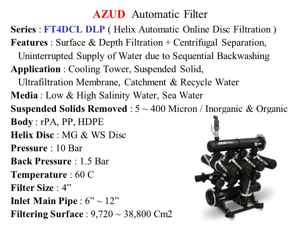 Azud series FT4DCL DLP is Online Filtration whereby Back Wash is done in sequence. Low head loss and minimum back wash water. Surface & Dept Filtration is Water & Energy saving.