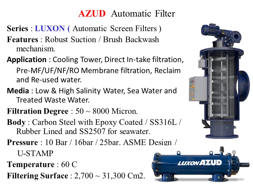 Azud from Spain is leader in making Disc type Automatic / Self Cleaning Filter. Filtration are based on Surface & Dept providing wide Filtration area. Backwash is efficient and effective, Use widely in Raw Water, Recycle Water, HVAC, Nozzle application in various industries.