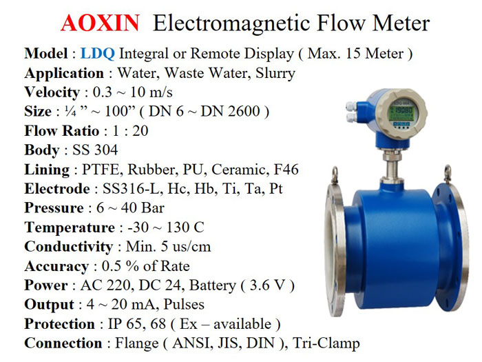 Aoxin Magnetic Meter series LDQ ideal untuk mengukur Debit dan Total pada Cairan Limbah, Abrasif, Korosif, Sanitary. Cocok untuk pabrik Gula, Kertas, Kimia, Baja, Minuman dsb.