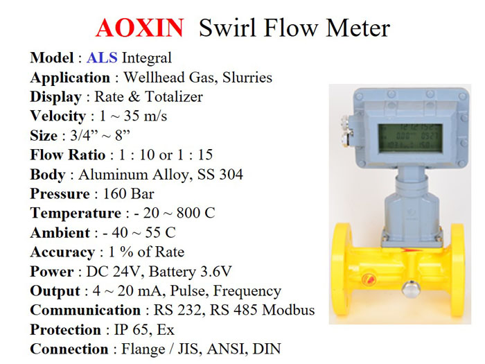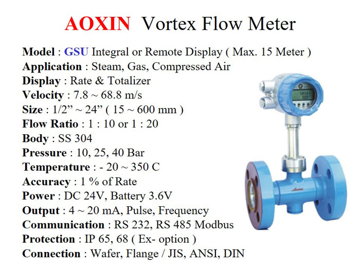 Aoxin Vortex Flowmeter series GSU ideal untuk mengukur Debit dan Total produksi Uap, Udara dan Gas. Cocok untuk aplikasi penghitungan nilai Produksi dan konsumsi uap pada Boiler & Mesin2 di pabrik. Juga sebagai Flow Transmitter untuk Process Flow Controls.