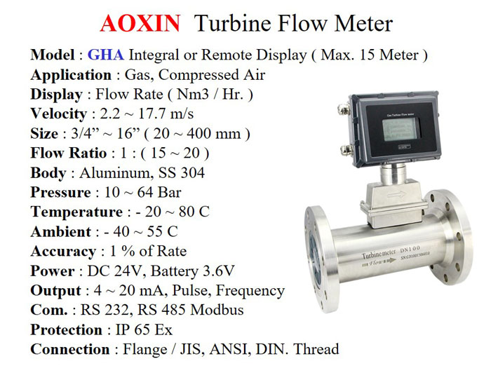 Jual Turbine Flowmeter khusus untuk mengukur aliran / debit Gas dengan batas kecepatan 2.2 s/d 17.7 m/s. Tekanan max. 64 Bar, Temperatur -20 ~ 80 C. Size 3/4" s/d 16". Body SS 304.