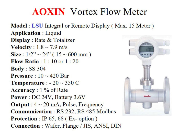 Jual Vortex Flowmeter untuk Cairan - Aoxin series LSU / Batas kecepatan 1.8 s/d 7.9 m/s. Tekanan max. 420 Bar, Temperatur -20 ~ 350 C. Size 1/2" s/d 24". Body SS 304. Wafer atau Flange connection.