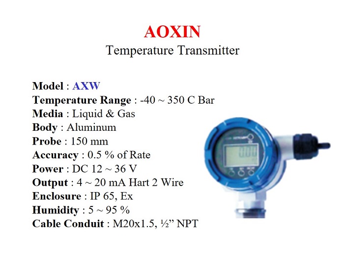 Jual Digital Temperature Gauge & Transmitter. Output 4 ~ 20 mA & Hart, Temperature : -40 s/d 350 C, Panjang Sensor 150 mm / Bimetal. Untuk Cairan & Gas, Akurasi 0.5% Rate. Enclosure IP 65 & Explosion Proof.