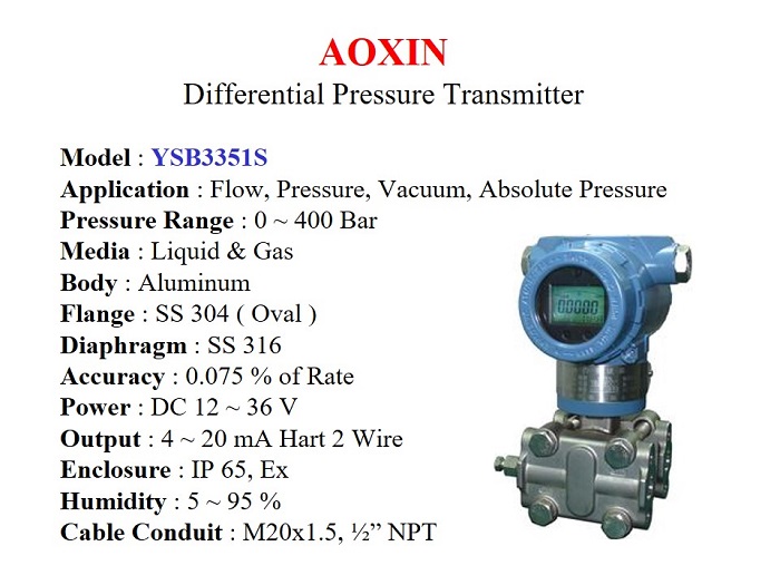 Jual Differential Pressure Transmitter. Signal Output 4 ~ 20 mA & Hart, Tekanan : Vacuum s/d 400 Bar, Untuk mengukur Aliran Cairan & Gas, Akurasi 0.075 % Rate. Enclosure IP 65 & Explosion Proof.