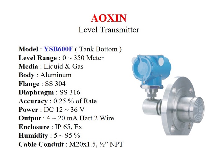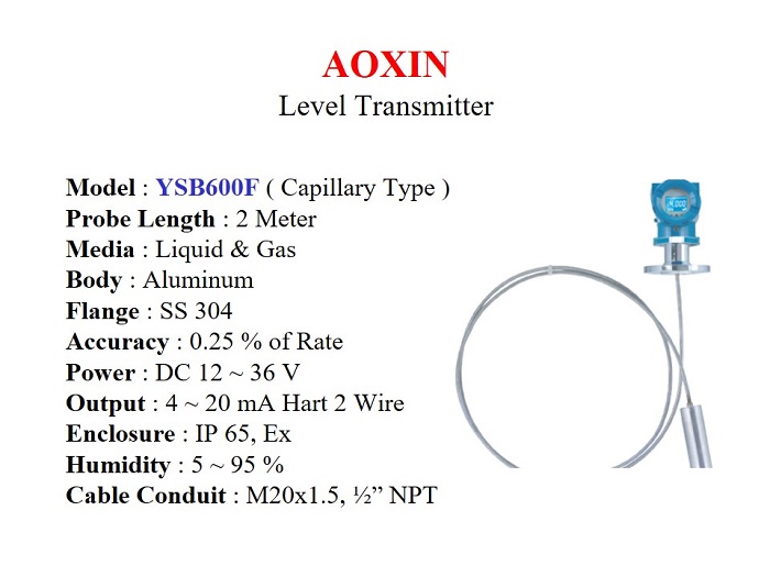 Jual Digital Pressure Transmitter untuk mengukur Level di-dalam Tanki. Output 4 ~ 20 mA & Hart, Temperature : -40 s/d 350 C, Panjang Capilarry 2,000 mm. Untuk Cairan, Akurasi 0.25% Rate. Enclosure IP 65 & Explosion Proof.