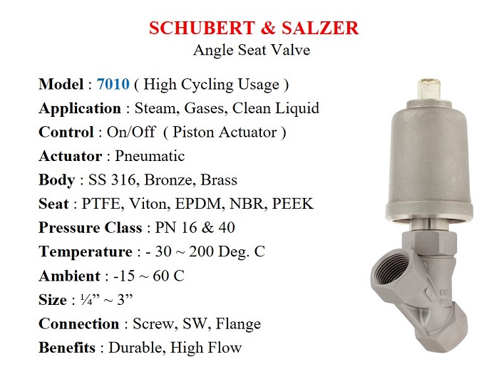 Jual Angle Seat High Cycle On/Off Valves - Schubert & Salzer series 7010 / PN 16 ~ 40, Screw & Flange, Size 1/4" ~ 3", Temp. -30 ~ 220 C, Pneumatic Piston Actuator ( Single or Double Acting ). Ideal for Batching & Filling application. Used widely as On/Off Steam, Air, Gas, Liquids application.
