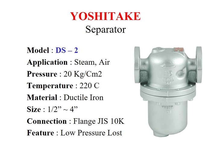 Yoshitake DS-1 series Mechanical Separator is used to clean basic Steam & Air from Dirt and Vapor to produce Clean & Dry Steam for consumption. This will result to less maintenance and downtime as Seat Abrasion is much reduced.