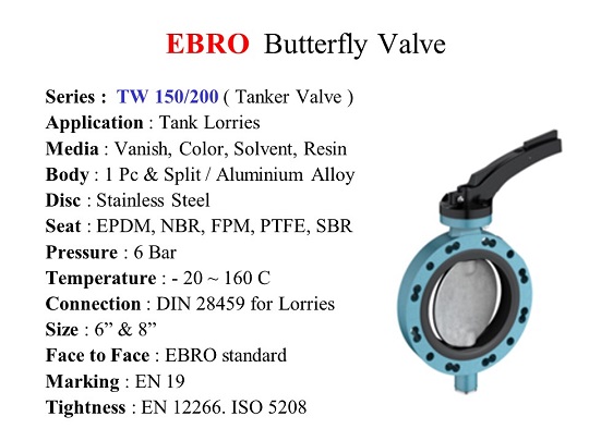 Jual Butterfly Valve untuk mobil Tanker merek EBRO series TW 150/200 dgn ukuran 6" & 8". Mudah di-operasikan.