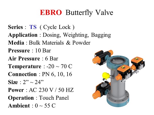 Jual paket Butterfly Valve untuk applikasi Batching merek EBRO series TS. Pengaturan oleh Control Panel untuk sequence control.
