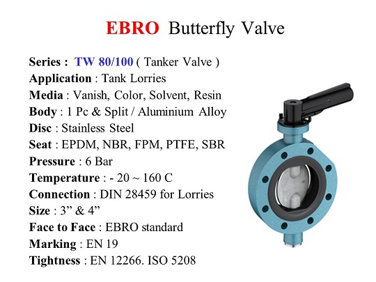 Jual Butterfly Valve untuk mobil Tanker merek EBRO series TW 80/100 dengan ukuran 3" & 4". Awet dan ringan di-operasikan.