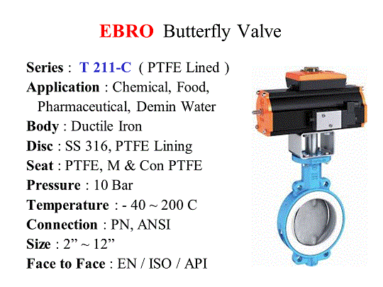 Jual PTFE Seat & PFA Lined Disc Butterfly Valve merek EBRO dari Jerman. Wafer type : T211-A, C. Lug type : T214-A, C. Double Flange type : T212-A.