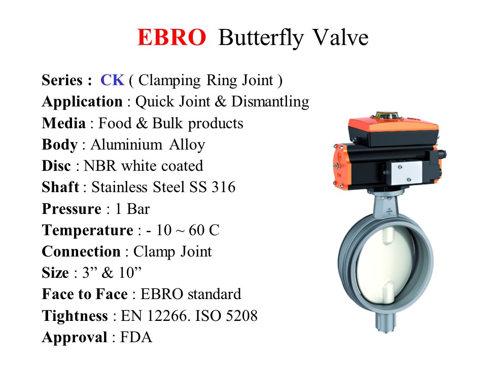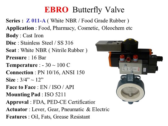 Jual EBRO Food Grade Butterfly Valve series Z011-A / White NBR seat & SS 316 Disc. FDA approved Oil Resistant Rubber ideal for Food & Beverage.