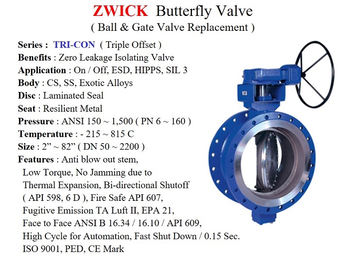 Zwick Tri-Con butterfly valve is Triple Offset design to cater for High Pressure & Temperature, Low Temperature Cryogenic. It's face to face is similar to ANSI Gate or Ball Valve. Outstanding performance is Zero Leakage.