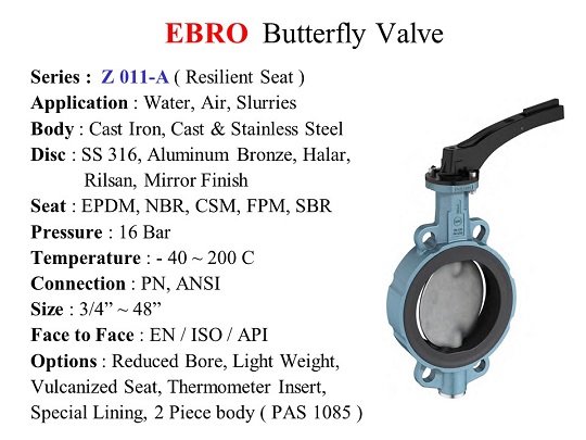 Jual Resilient / Rubber Seat Butterfly Valve merek EBRO dari Jerman. Wafer type : Z011 - A, B, AS, GMX. Z411-A. Z611-A, C, K. Lug type : Z014-A, WN. Z414-A. Z614-A, C, K. Double Flange : F012-A, K1, WN. Single : M015-A.
