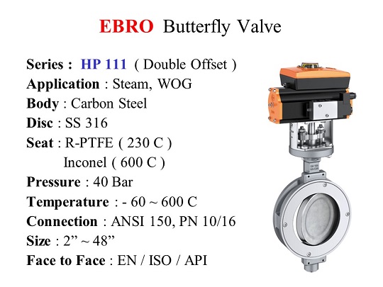 Jual High Performance / Double Offset Butterfly Valve merek EBRO dari Jerman. Wafer type : HP111. HP111-E. Lug type : HP114. HP114-E, C, K3, 300. Double Flange type : HP112.