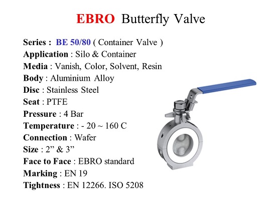 Jual Butterfly Valve untuk Silo / Container merek Ebro series BE50/80. Solid dan ringan di-operasikan.