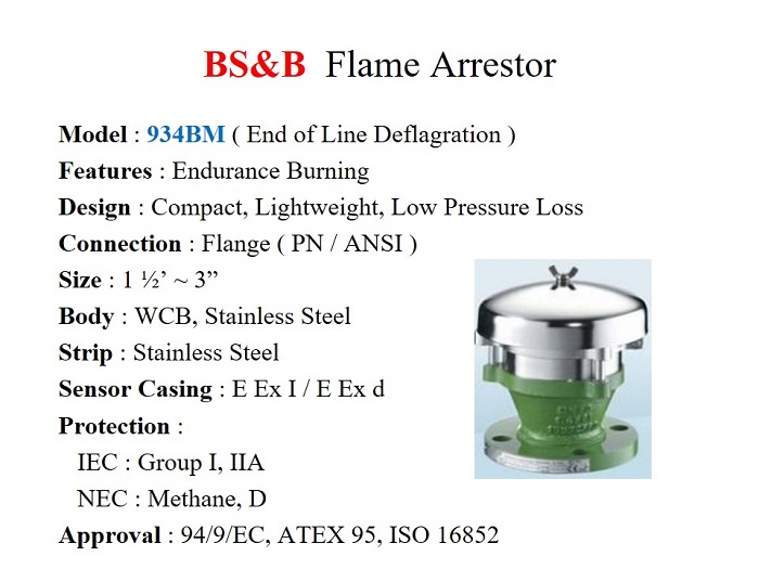 Flame Arrestor is widely used for Gas Vapor found in Tank Farm and Processes. It is to prevent Explosion when Spark of fire occurred in Gas Stream. BS&B 931B series is Inline, Screw connection.