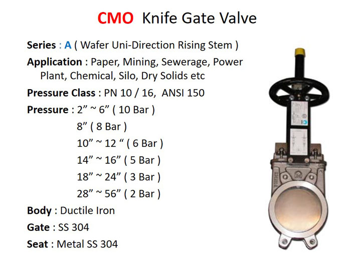 Jual CMO Knife Gate Valve series A / Wafer PN 16, ANSI 150, Ductile Iron Body, Stainless Steel / SS 304 Gate & Seat. Size 2" s/d 56". Ideal untuk Slurries , Sludges, Plastic Chips.