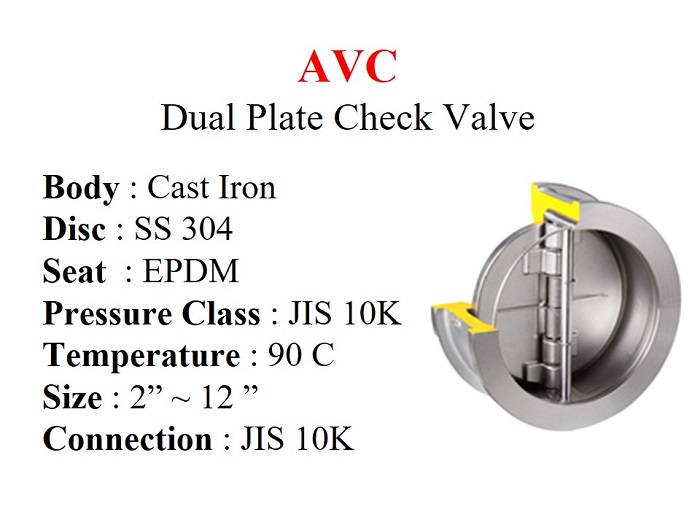 AVC Cast Iron Dual Plate Check Valve is widely used in Low Pressure water application in Plumbing, HVAC installation. The Valve fits various Flange option : JIS 10K, PN 16, ANSI 150. It is also called Silent Check Valve due to Quick Closing action driven by Spring when the Pump stops operating. Thus preventing Water Hammer from happening.